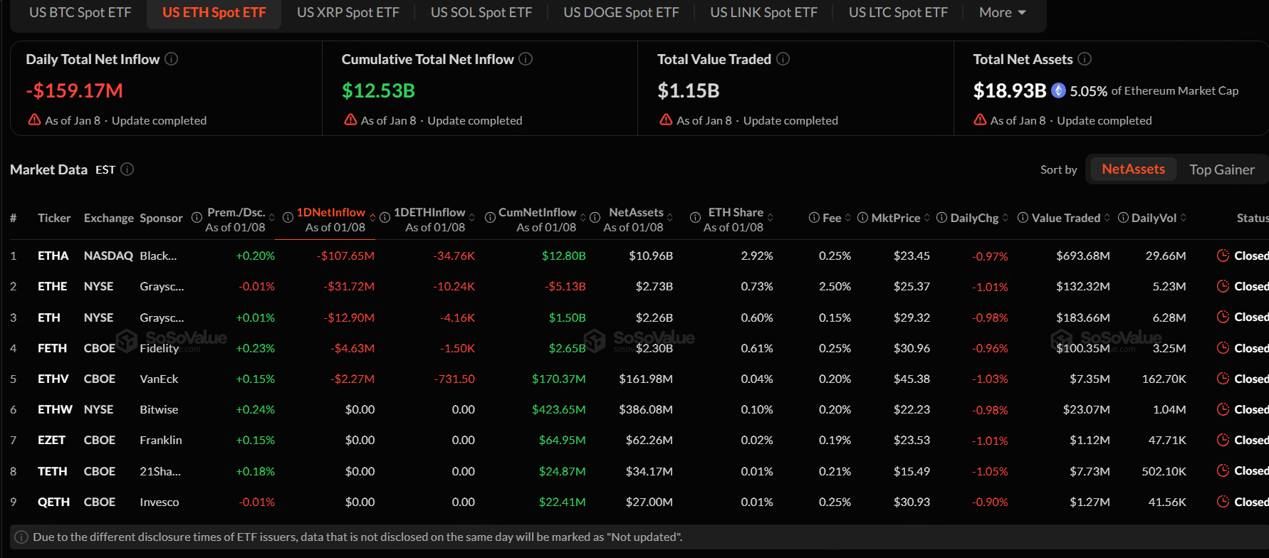 The Ethereum spot ETF with the highest net outflow on January 8 was iShares Ethereum Trust ETF (ETHA), with a net outflow of $107.65 million, according to SoSoValue.