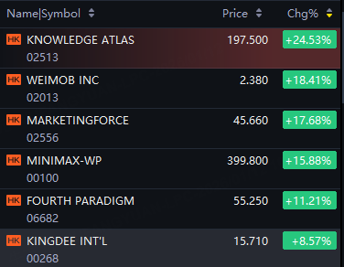 Knowledge Atlas up 25%; Weimob, Marketingforce up 18%; MiniMax up 16%; Fourth Paradigm up 11%; Kingdee Int’l up 9%.