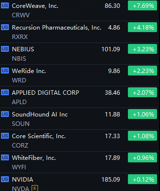 Nvidia Concept Stocks Rally. CoreWeave up 8%; Recursion up 4%; Nebius up 3%; WeRide and Applied Digital up 2%; SoundHound up 1%.
