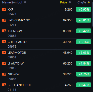 EV stocks rose in Hong Kong on Tuesday. BYD up 4%; XPeng, Leapmotor up 3%; Li Auto, Nio up 2%.