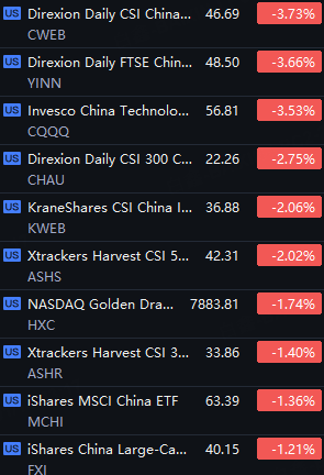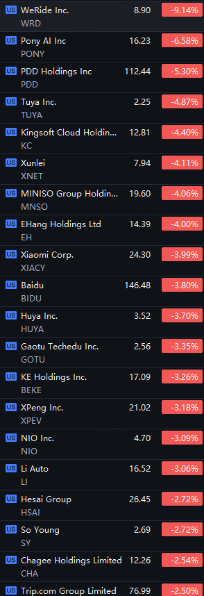 Chinese ETFs And ADRs Dropped. WeRide fell 9%; Pony AI down 7%; PDD down 5%; Baidu and CWEB down 4%; YINN, NIO, XPeng and Li Auto fell 3%.
