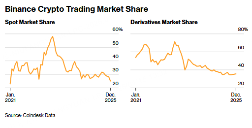 The world’s largest digital asset exchange’s percentage of overall spot trading fell to 25% in December to its lowest level of that market share since January 2021, according to CoinDesk Data. It was 28.5% in November. At its peak in 2023, the platform handled close to 60% of all spot crypto trades where actual ownership of the assets changes hands quickly, or on the “spot.”