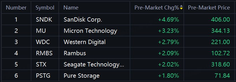 SanDisk up over 4% as Bernstein raised its price target on SanDisk to $580; Micron up over 3%; Western Digital, Seagate up over 2%.