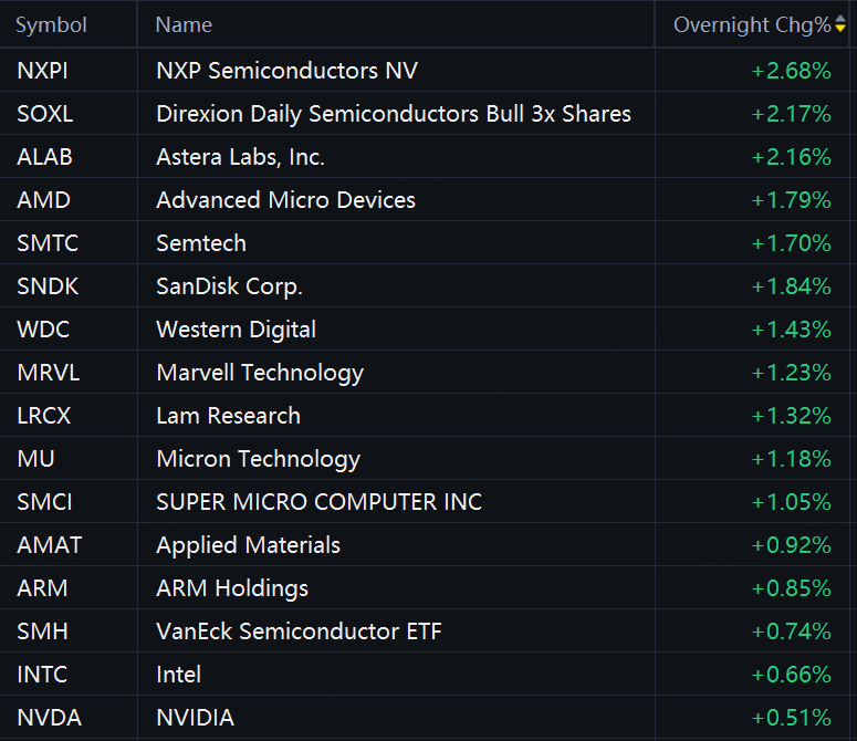 Some chip stock rose again in overnight trading. NXP Semiconductors rose 3%; Direxion Daily Semiconductors Bull 3x Shares, SanDisk, AMD, Semtech, and Western Digital rose 2%.