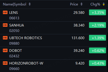 HK robotics stocks jumped on Friday. Lens up 3%; Sanhua up 2%; Ubtech Robotics, Horizon Robotics up 1%.