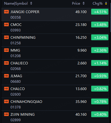 Nonferrous metal shares jumped in Hong Kong on Friday. Jiangxi Copper up 5%; CMOC, CHINFMINING up 3%; MMG up 2%; CHALIECO, CHALCO up 1%.