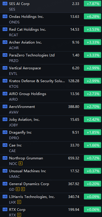 Defense & Drone Stocks Rally. SES AI up 8%; Ondas up 6%; Red Cat, Archer Aviation, ParaZero, Vertical Aerospace and Kratos up 3%.
