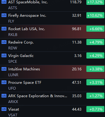 Space Stocks Jump. AST SpaceMobile up 17%; Firefly up 11%; Rocket Lab up 7%; Redwire and Virgin Galactic up 4%; Intuitive Machines up 3%.