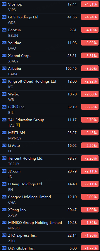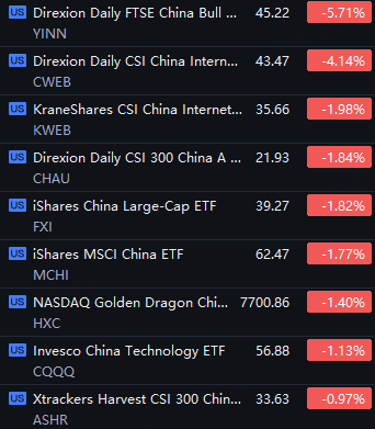 Chinese ETFs And ADRs Dropped. YINN down 6%; CWEB, GDS and Vipshop Down 4%; Alibaba, Xiaomi and KingSoft Cloud down 3%.