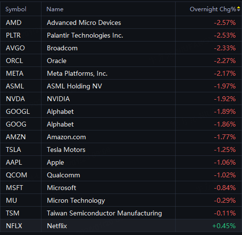 Big tech stocks fell in overnight trading. AMD, Palantir fell 3%; Nvidia, Alphabet, Meta, ASML, Broadcom, Oracle, Amazon down 2%; Tesla, Apple fell 1%.