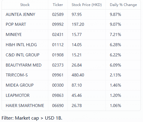 Risk sentiment was shaped by company-specific flows and sector catalysts. Consumer names outperformed, led by POP MART on buyback support, while mainland developers gained amid improved property sentiment. News highlights during the session noted strength across new consumption and AI app stocks, and a rally in gold-related counters as safe-haven demand intensified intraday.