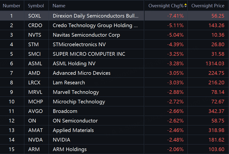 Chip stocks fell in overnight trading. SOXL down over 7%; Navitas down 5%; SMCI, AMD, ASML down over 2%; Marvell Technology, Broadcom down over 2%.