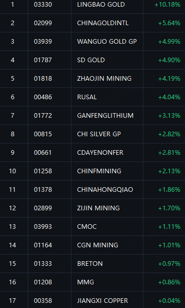 HK Movers|Nonferrous Metal Shares Jump. Lingbao Gold Up 10%; ChinaGold Up 6%; Wanguo Gold And SD Gold Up 5%; Zhaojin Mining And Rusal Up 4%; Ganfenglithium Up 3%