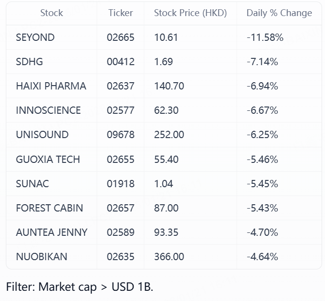 Large-cap tech was mixed but net positive. Semiconductors led: Hua Hong Semi (+5.17%) and SMIC (+3.69%) benefited from improving sentiment toward chip manufacturing and supply-chain visibility. Platform and internet names were uneven: Alibaba (+2.19%) and Kuaishou (+3.62%) rose, while Tencent (+0.25%) ticked higher and NetEase (-3.70%) slipped. Hardware-linked names like BYD Electronic (+2.45%) and Sunny Optical (+2.16%) added support.