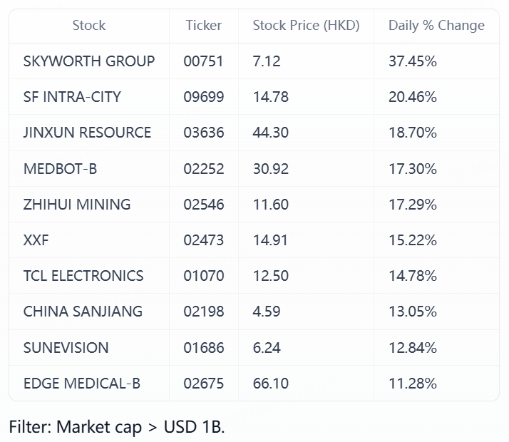 Outside tech, company-specific catalysts drove notable moves. Skyworth Group (+37.45%) surged after announcing plans to spin off its photovoltaic business and pursue a go-private transaction—an MT Newswires report highlighted the restructuring as a pathway to unlock value and fund growth in solar. Robotics-related names saw interest intraday (Tiger Newspress flagged strength in Medbot and peers), consistent with gains in Health Care Equipment and related tech segments. Nonferrous metals and gold-linked counters also attracted bids amid a supportive commodity tape noted by local media.