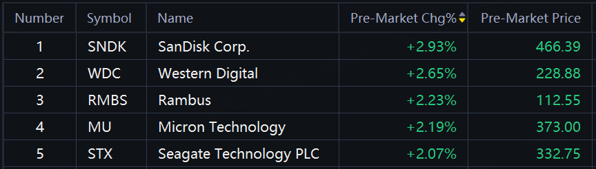Storage shares rallied in premarket trading. SanDisk up nearly 3%; Western Digital, Rambus, Micron, Seagate Technology up over 2%.