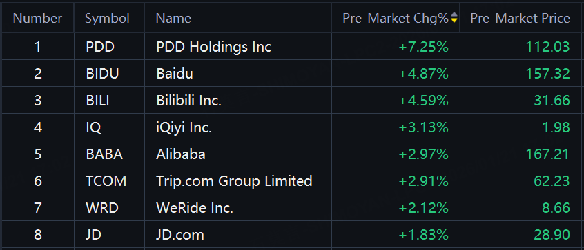 Chinese ADRs and ETFs rose in premarket trading. PDD Holdings soared over 7%; Baidu, iQiyi up over 4%; Alibaba, Trip.com up about 3%; JD.com up nearly 2%.
