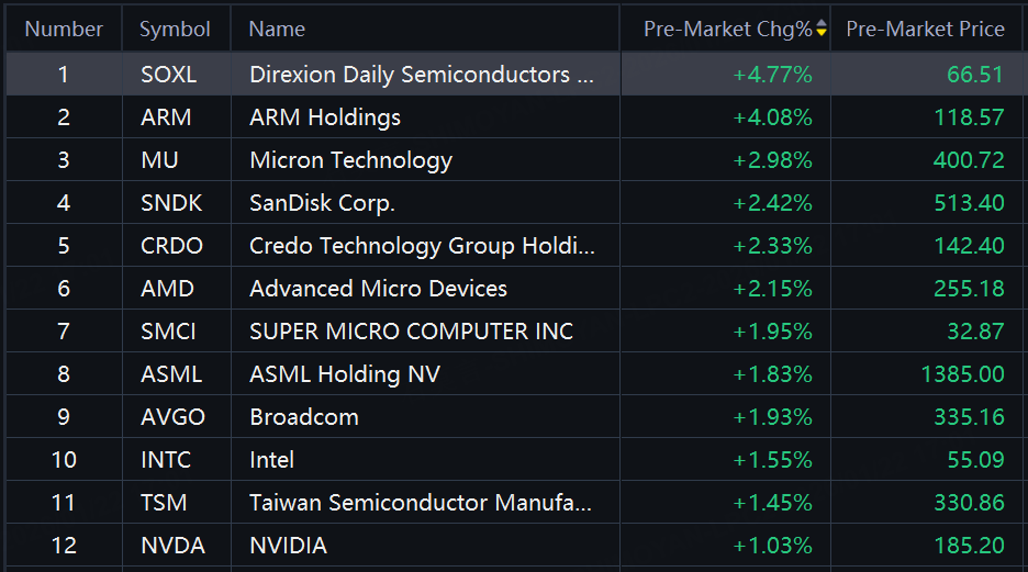 Chip stocks rallied in premarket trading. SOXL, ARM Holdings up over 4%; Micron up 3%; SanDisk, Credo, AMD, SMCI, ASML, Broadcom up around 2%.