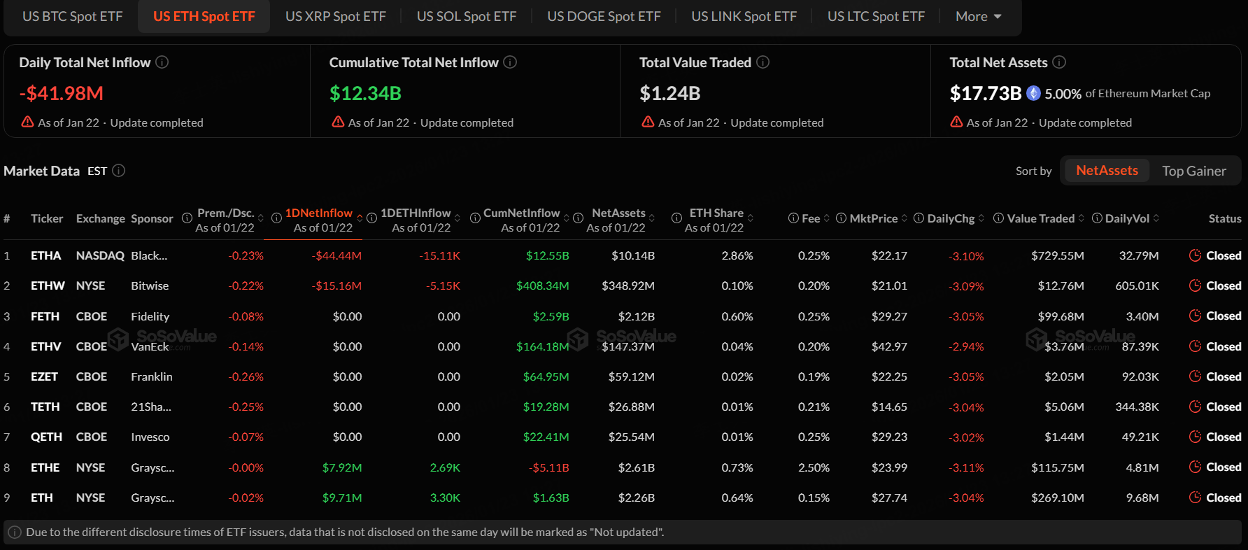 The Ethereum spot ETF with the highest net outflow on January 22 was iShares Ethereum Trust ETF (ETHA), with a net outflow of $44.44 million, according to SoSoValue.