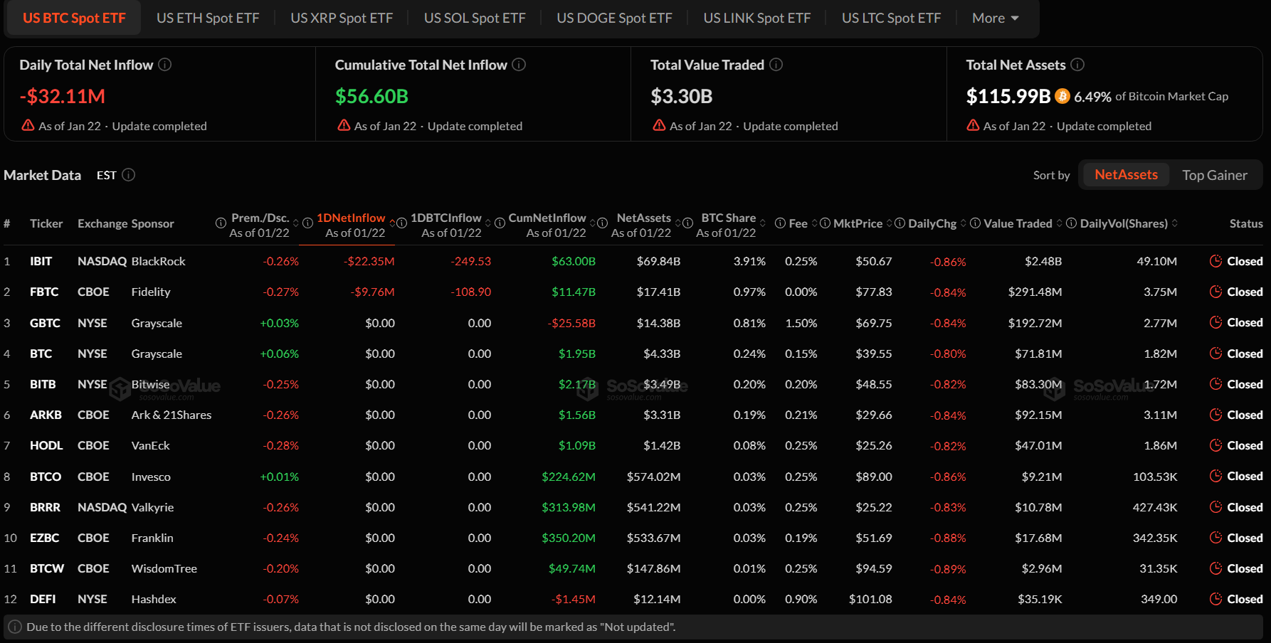 The Bitcoin spot ETF with the highest net outflow on January 22 was iShares Bitcoin Trust (IBIT), with a net outflow of $22.35 million, according to SoSoValue.
