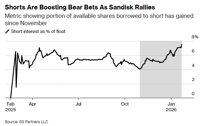 According to analytics firm S3 Partners LLC, short interest in Sandisk Corp. has surged for months, moving in tandem with the stock's sharp rally and elevating the risk of a short squeeze to what is described as an "extreme" level.