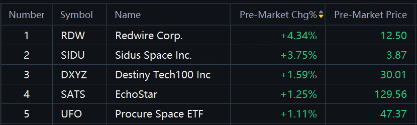 Space stocks rose in premarket trading. Redwire, Sidus Space up around 4%; EchoStar up over 1%.