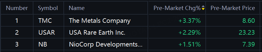 Rare earth stocks jumped in premarket trading. The Metals up over 3%; USA Rare Earth up over 2%; Niocorp up over 1%.
