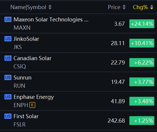 Solar stocks jumped on Friday. Maxeon Solar up over 24%; JinkoSolar up over 10%; Canadian Solar up over 6%; Sunrun, Enphase Energy up over 3%.