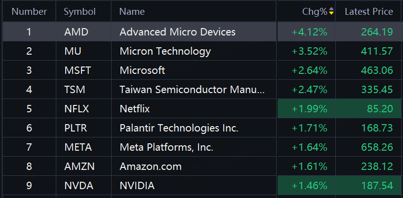 Big tech stocks mostly jumped on Friday. AMD up over 4%; Micron up over 3%; Microsoft, TSMC, Netflix up around 2%; Palantir, Meta, Amazon, Nvidia up over 1%.