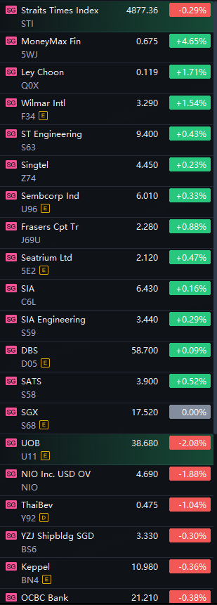 Singapore stocks opened lower on Monday. STI fell 0.3%; MoneyMax up 5%; Ley Choon and Wilmar up 1%; UOB and Nio down 2%; ThaiBev down 1%.