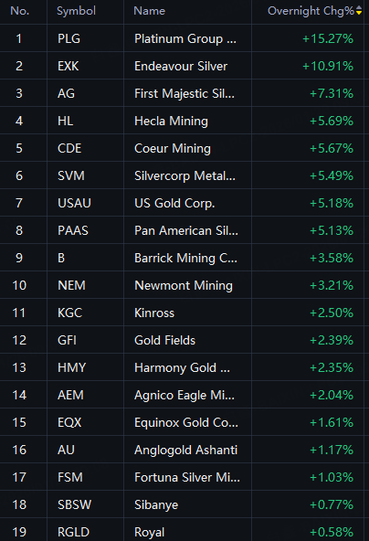 Precious metals shares shine in overnight trading. Platinum Group up 15%; Endeavour Silver up 11%; First Majestic Silver up 7%; Hecla Mining, Coeur Mining, Silvercorp, US Gold and Pan American Silver up 5%.
