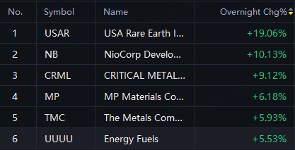 Rare earth stocks rally in overnight trading. USA Rare Earth up 19%; NioCorp up 10%; Critical Metals up 9%; MP and The Metals up 6%; Energy Fuels up 5%.