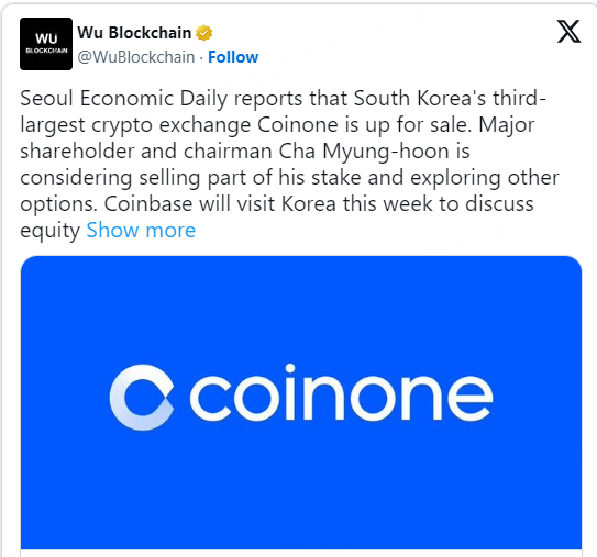 South Korea’s third-largest cryptocurrency exchange, Coinone, is reportedly up for sale as major shareholders look to capitalize on a wave of industry consolidation. Chairman Cha Myung-hoon, who controls a 53.44% stake alongside his holding company, is exploring options to divest a portion of his shares.