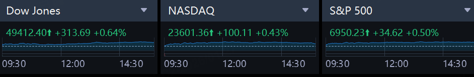 As of Jan 27, the U.S. major indexes closed as follows: the Dow Jones Industrial Average up 0.64% at 49412.40; the S&P 500 up 0.50% at 6950.23; and the Nasdaq Composite up 0.43% at 23601.36.