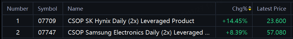 CSOP SK Hynix Daily 2x Leveraged Product surged over 14% after local media said the company is the sole supplier of advanced memory for Microsoft Corp.’s new artificial intelligence chip. CSOP Samsung Electronics Daily 2x Leveraged Product jumped over 8%.