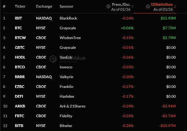 The Bitcoin spot ETF with the highest net inflow on January 26 was iShares Bitcoin Trust (IBIT), with a net inflow of $15.93 million, according to SoSoValue.