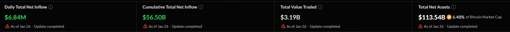 U.S. spot Bitcoin ETFs recorded total net inflows of $6.84 million on Jan. 26, snapping a five-day streak of net outflows, according to Farside Investors. Spot Ethereum ETFs also turned positive, posting $117 million in net inflows after four consecutive days of outflows. Meanwhile, Solana spot ETFs saw net inflows of $2.46 million, while XRP spot ETFs recorded $7.76 million in net inflows.
