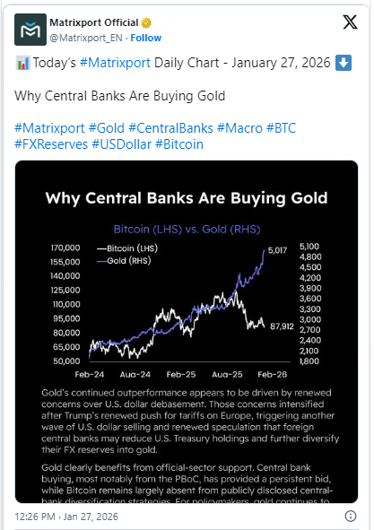 Matrixport said continued gold purchases by central banks are supporting gold’s strength while putting relative pressure on Bitcoin. According to Mars Finance, the firm noted that rising concerns over the weakening purchasing power of the U.S. dollar, amid renewed tariff pushes and speculation over reduced foreign holdings of U.S. Treasuries, have driven central banks to shift more reserves into gold.