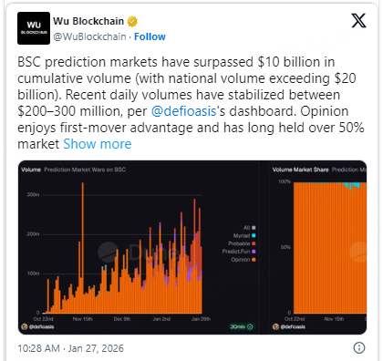 Prediction markets on BNB Smart Chain (BSC) have reached a historic $10 billion in cumulative trading volume, with national volumes soaring past the $20 billion mark. According to the latest dashboard data from Defi Oasis, the sector has entered a phase of mature growth, with daily volumes stabilizing between $200 million and $300 million.