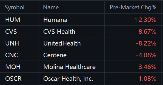 Humana fell 12%; CVS Health fell 9%; UnitedHealth fell 8%; Centene and Molina Healthcare fell 4%; Oscar Health fell 1%.