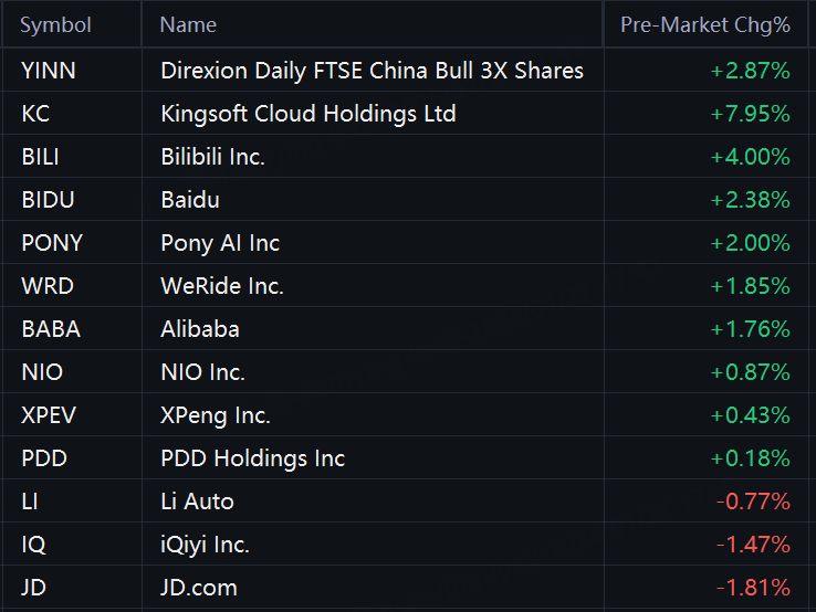 Chinese ADRs rose in premarket trading. Direxion Daily FTSE China Bull 3X Shares rose 3%; Kingsoft Cloud rose 8%; Bilibili rose 4%; Baidu, Pony AI, WeRide, and Alibaba rose 2%; while JD.com and iQiyi fell about 2%.