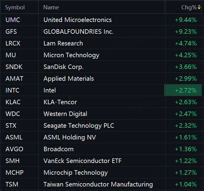 Some chip stocks jumped in morning trading. United Microelectronics and GlobalFoundries rose 9%; Lam Research rose 5%; Micron and SanDisk rose 4%; Applied Materials, Intel, KLA-Tencor, and Western Digital rose 3%; Seagate and ASML rose 2%; Broadcom, VanEck Semiconductor ETF, and TSMC rose 1%.