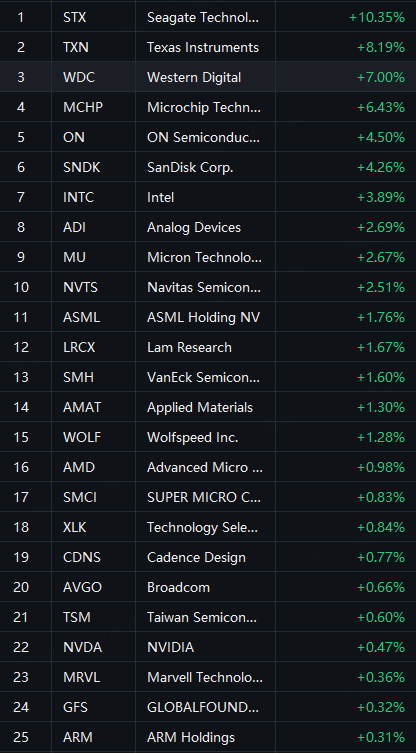Chip shares rallied in overnight trading. Seagate up 10%; TI up 8%; Western Digital up 7%; Microchip up 6%; ON Semi, Intel and SanDisk up 4%; Micron up 3%; ASML up 2%.