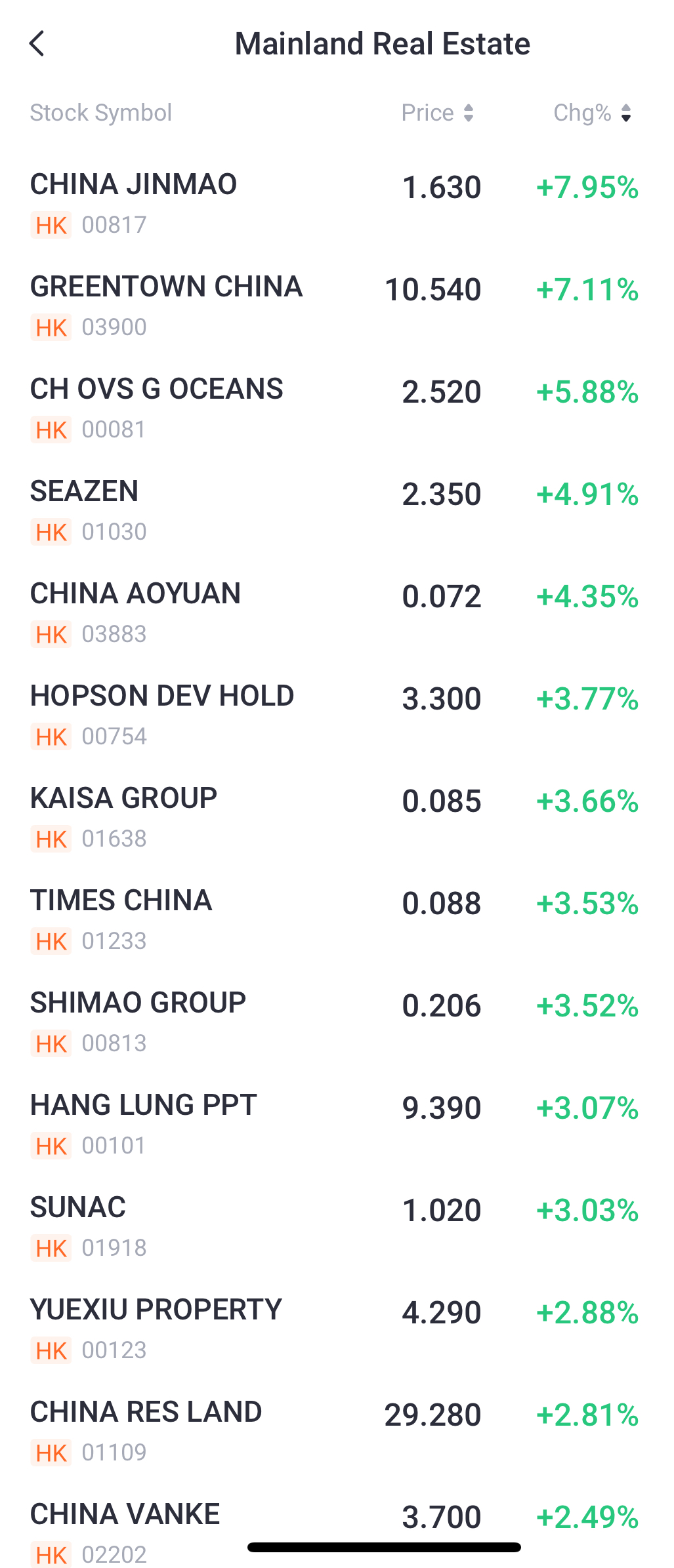 Mainland real estate shares jumped in Hong Kong market. China Jinmao up 8%; Greentown China up 7%; Seazen up 5%; China Vanke up over 2%.