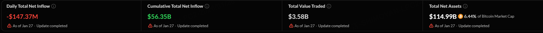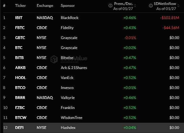 The Bitcoin spot ETF with the highest net outflow on January 27 was iShares Bitcoin Trust, with a net outflow of $102.81 million, according to SoSoValue.