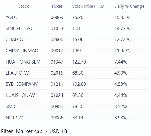 Large-cap tech was a focal point. Tencent +2.31% (HK$621.00) firmed, aided by reports it seeks to expand cloud infrastructure in the Middle East. Alibaba +2.12% (HK$173.50), JD-SW +2.47% (HK$116.30), Meituan +1.86% (HK$98.35), and Bilibili +3.61% (HK$281.00) participated. Chip-related momentum persisted: Hua Hong Semi +7.44% and SMIC +3.52% benefited from upbeat semiconductor demand narratives, while news that China approved imports of Nvidia’s H200 AI chips added to sentiment. An AI-linked levered product tied to SK Hynix surged intraday after the memory maker posted record quarterly profits on intense AI demand.