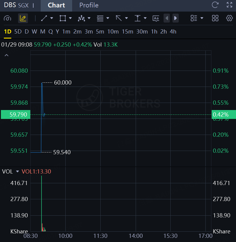 Singapore's DBS Bank share price has touched S$60.00 for the first time, setting a new intraday high.
