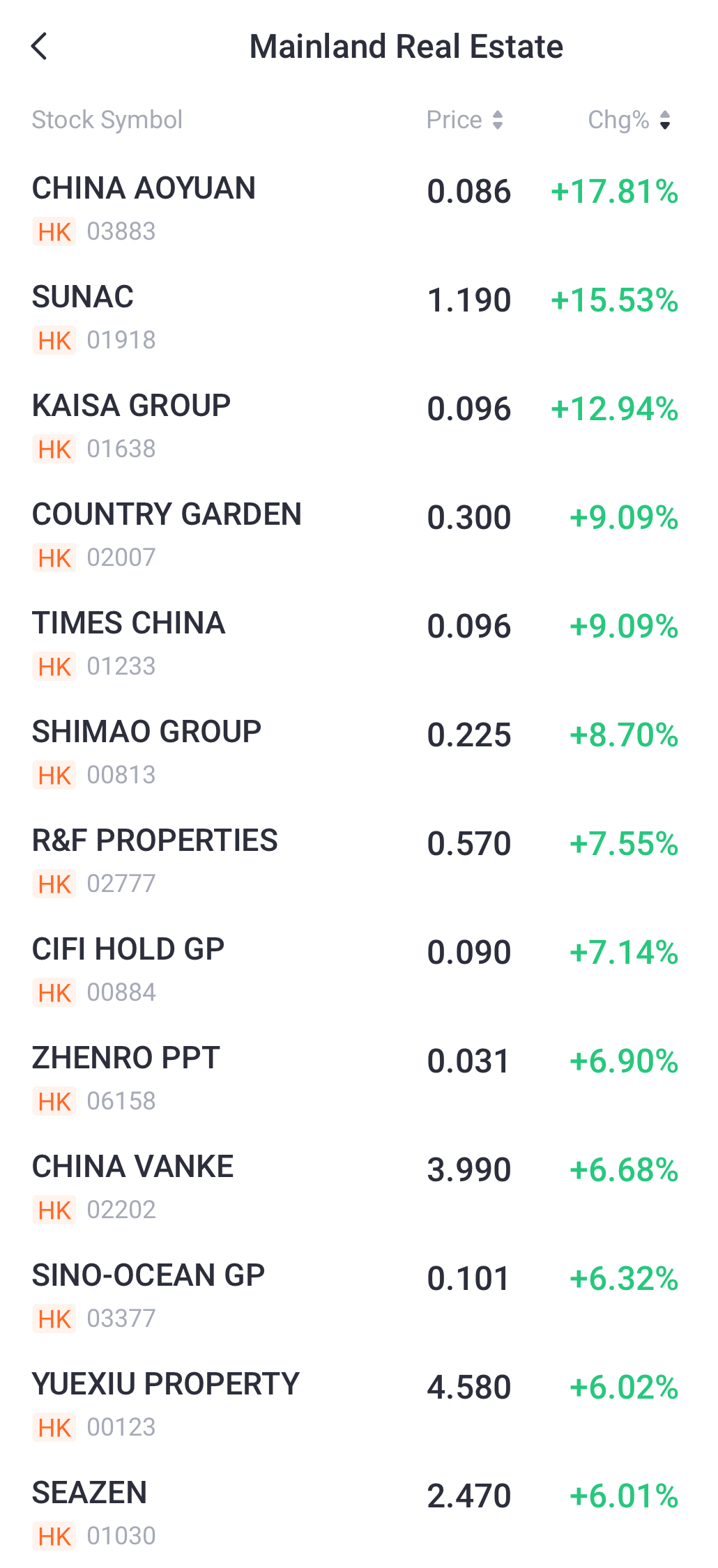 Mainland real estate shares jumped on Thursday. SUNAC surged 16%; Country Garden, Shimao Group up around 9%; China Vanke up over 6% as it buys time in crisis with $417 million of bond payments.