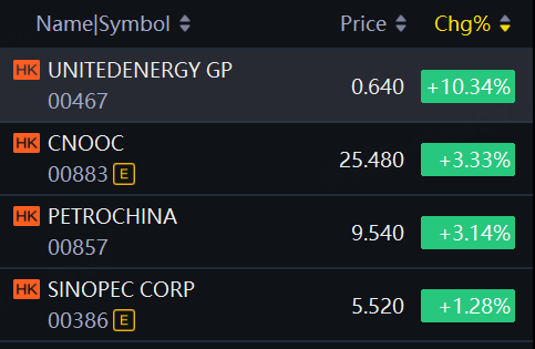 Oil & gas producers jumped in Hong Kong market. United Energy Group up 10%; CNOOC, PetroChina up over 3%; SINOPEC up over 1%.
