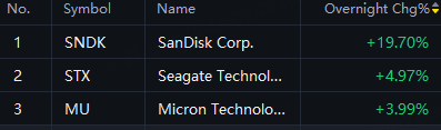Storage shares jump in overnight trading. SanDisk up 20%; Seagate Technology up 5%; Micron up 4%.